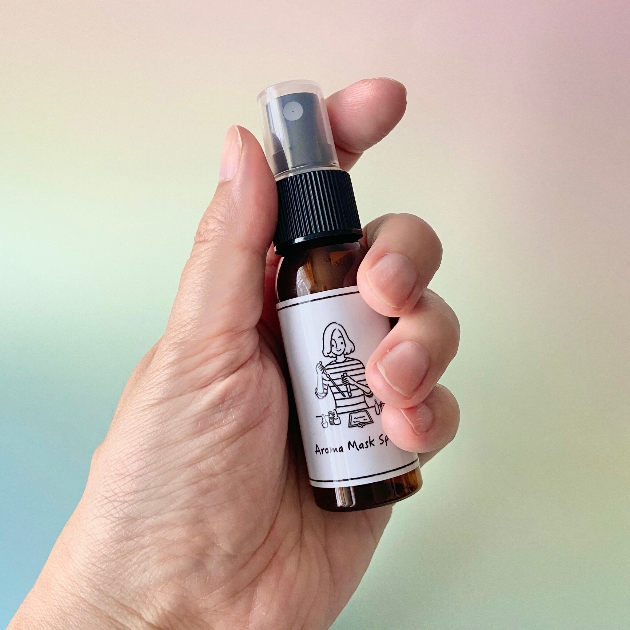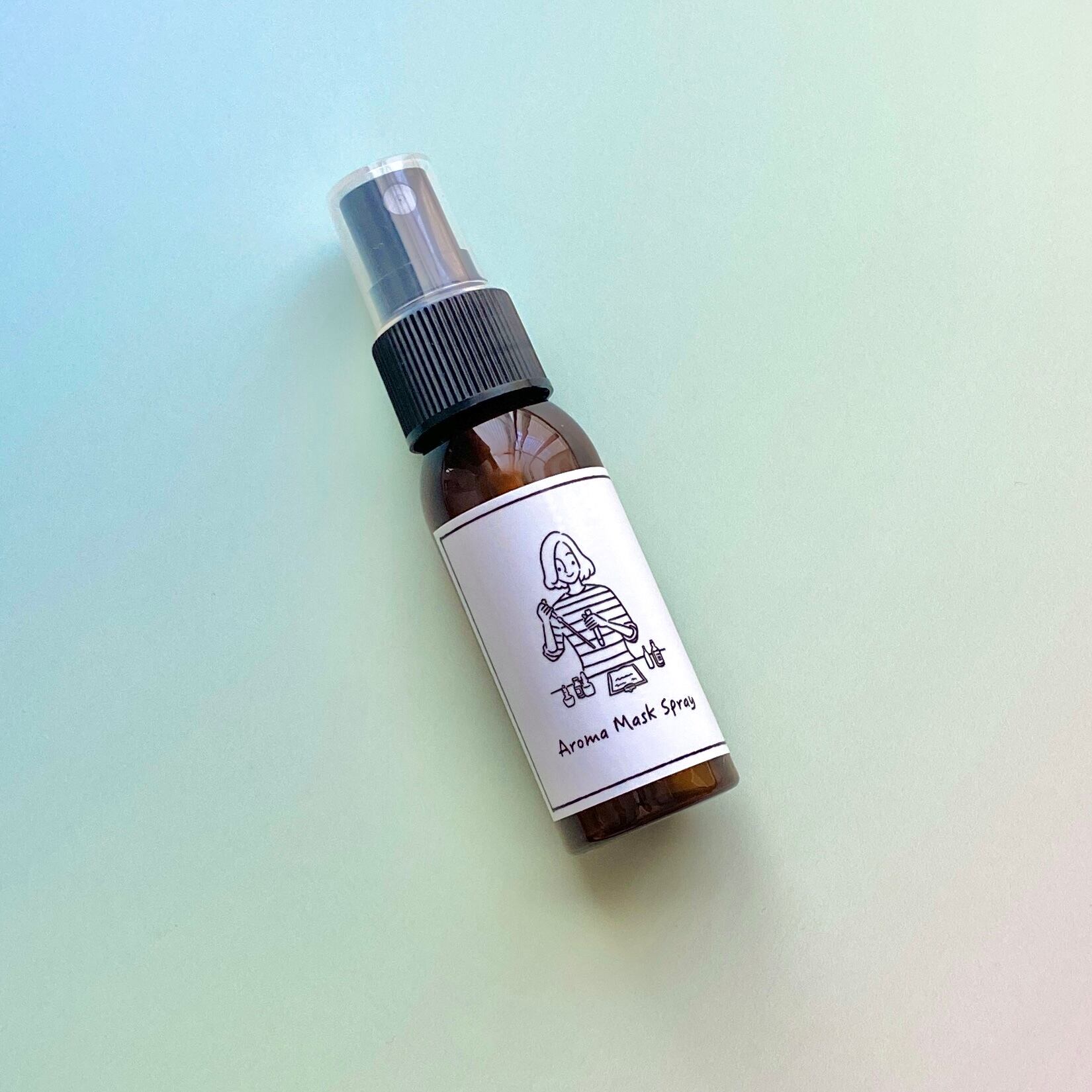 ボトルを軽く振ってからマスクの外側に2〜3プッシュして、少し待ってマスクを装着してください。